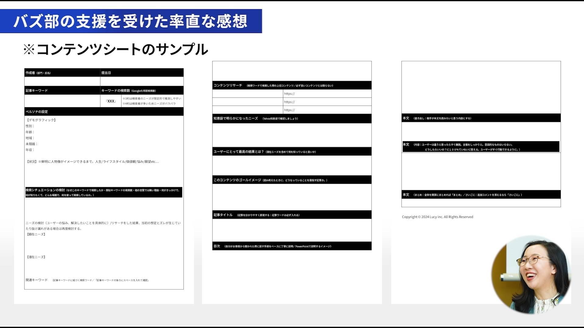 コンテンツシートという設計図をバズ部から提供いただいたんですが、読者(ユーザー)のニーズ、顕在ニーズ、潜在ニーズ、目指す最高の結果…など、「ここまで考えなきゃいけないのか」と思うほどの項目が用意されていてびっくりしました。