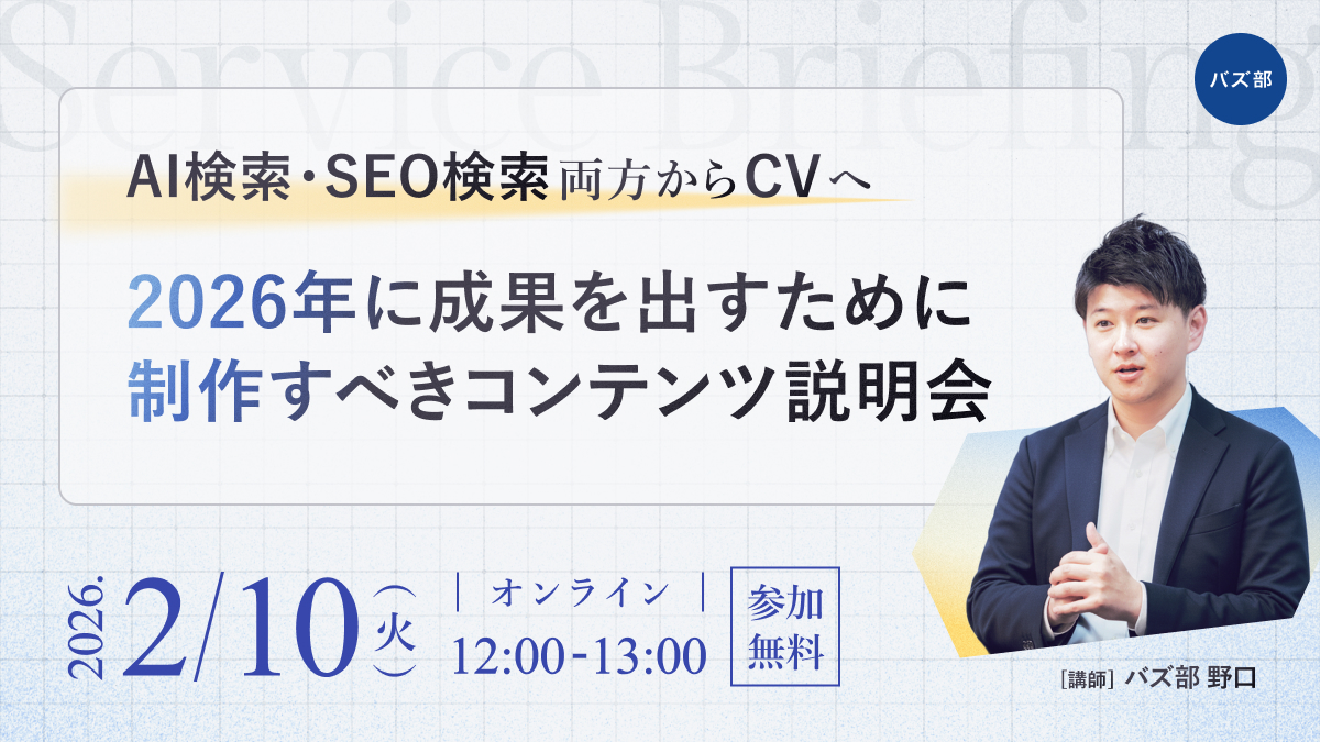 1月15日に開催しましたバズ部の説明会「2026年に成果を出すために制作すべきコンテンツ」説明会について、2月10日(火)12:00〜13:00に追加開催をすることにいたしました。