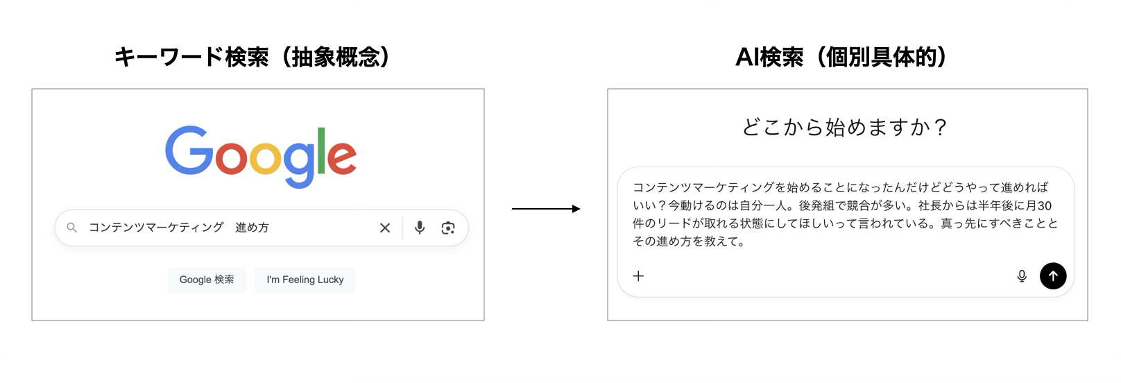 従来のキーワード検索は抽象的な概念について問われるものでしたが、AI検索では個別具体的な質問が飛び交います。