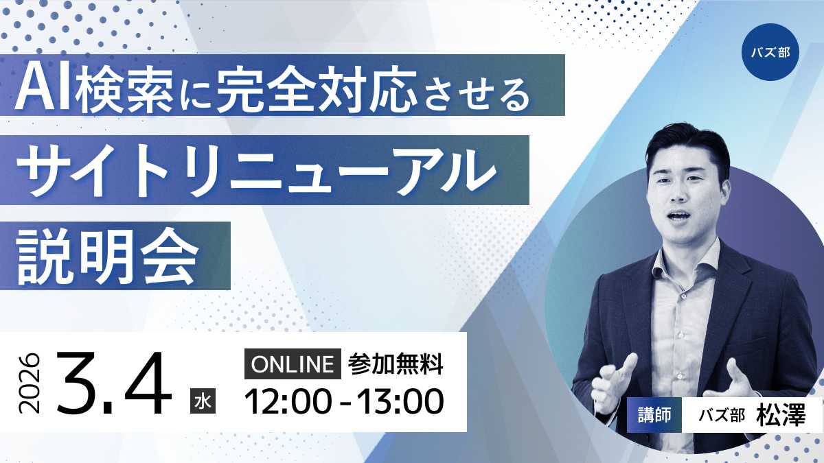 5/20(水)12:00〜13:00に「AI検索に完全対応させるサイトリニューアル説明会」を開催します。