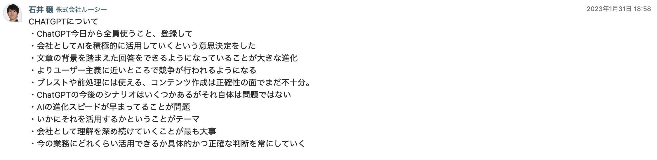 2022年の年末にChatGPTが公開されて、その2か月後には、社内で「全員でAIを使っていく」という方針を出しました。
